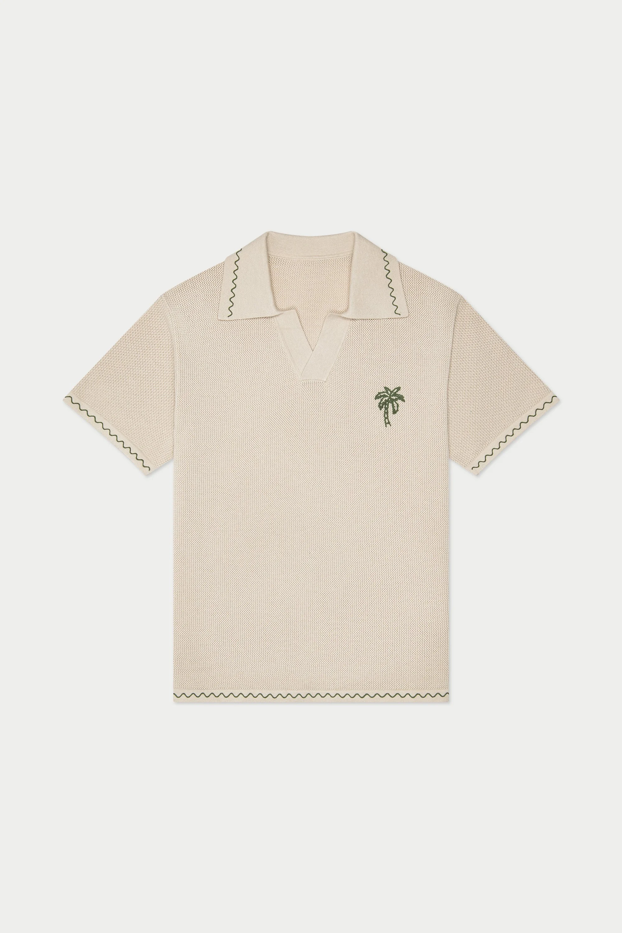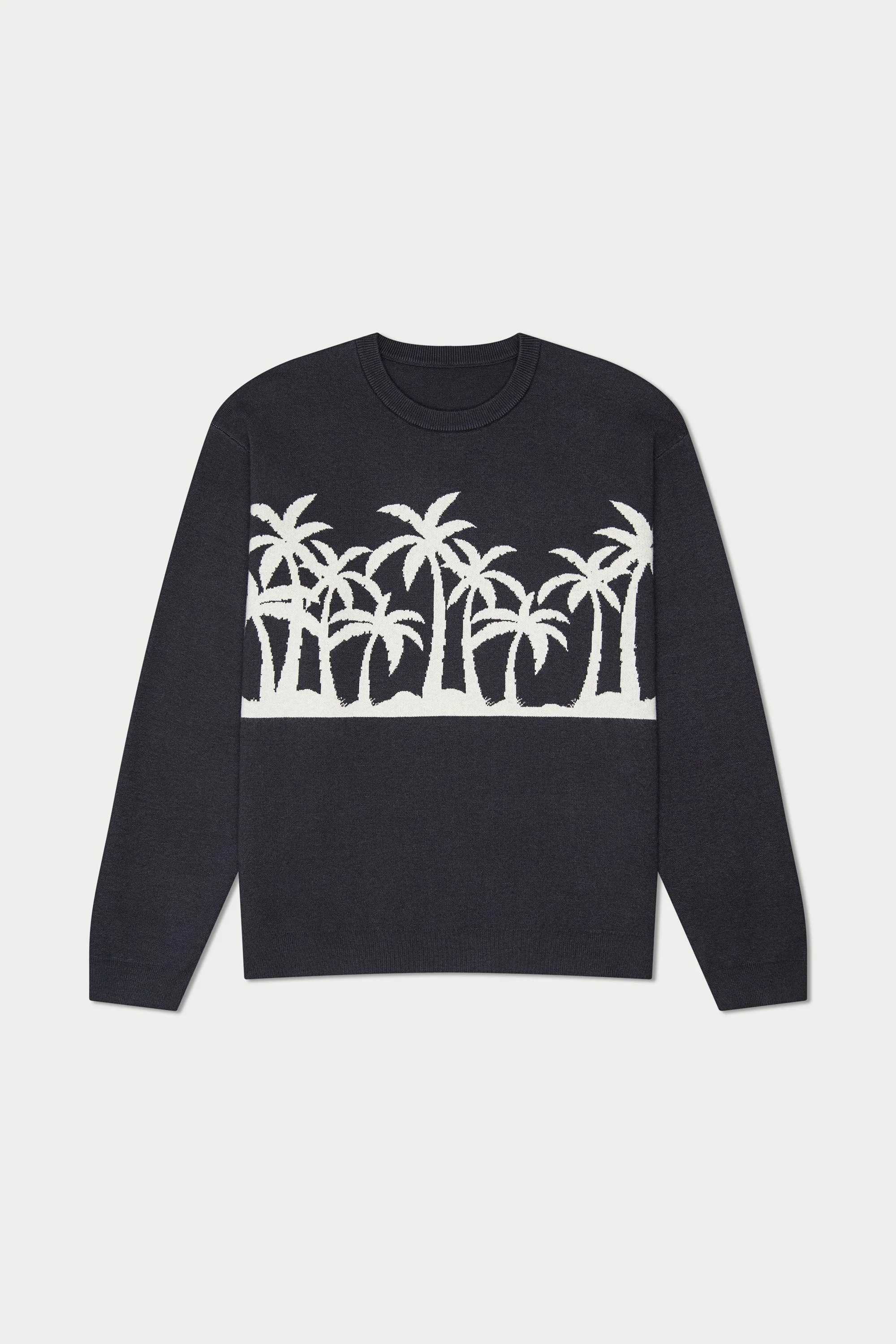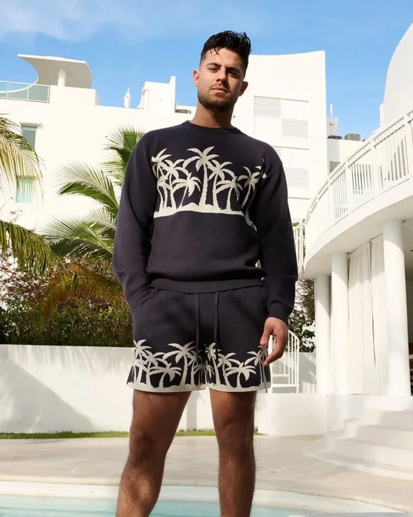 Palm tree motifs embroidered and printed on polos, shorts, and crew sweaters.