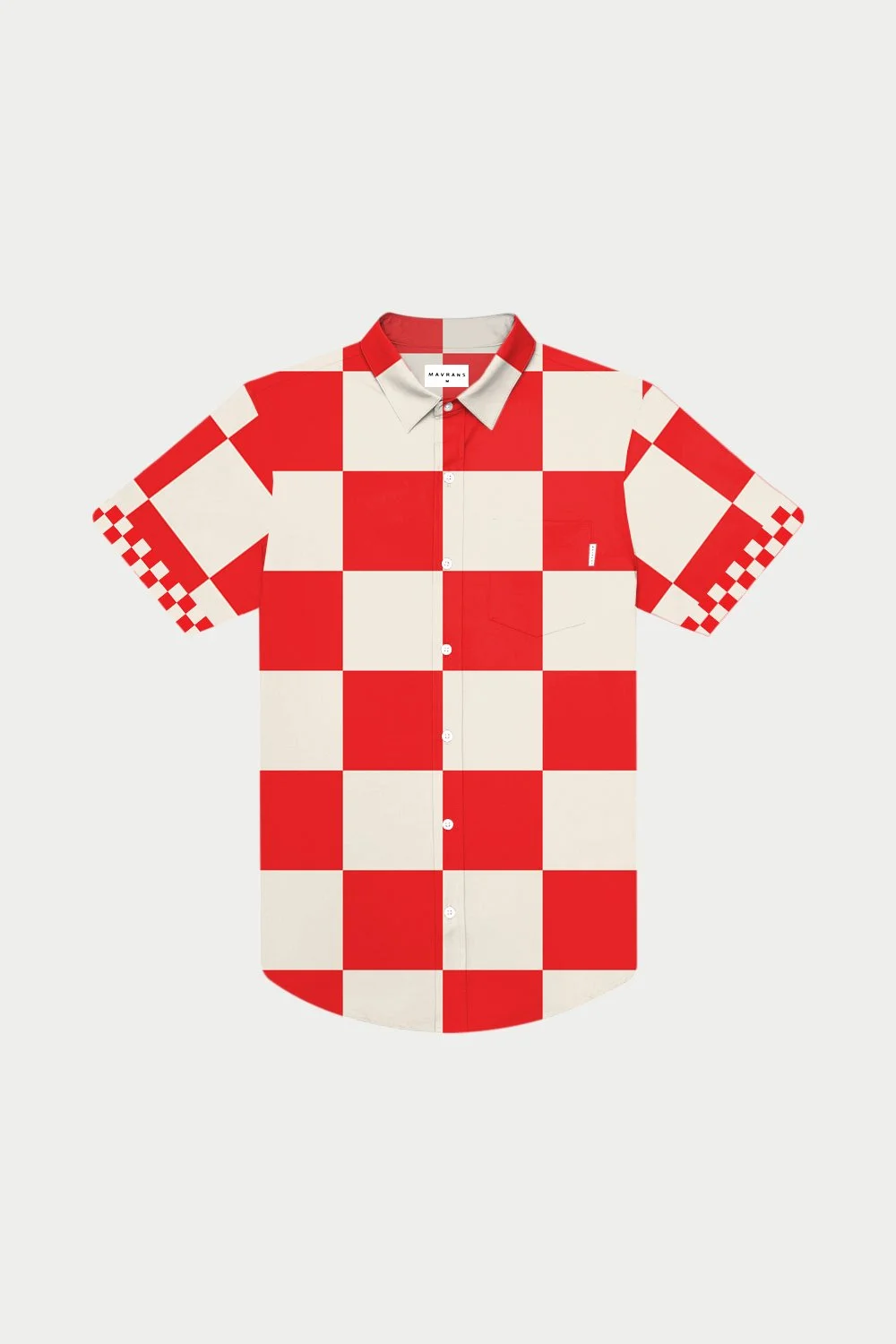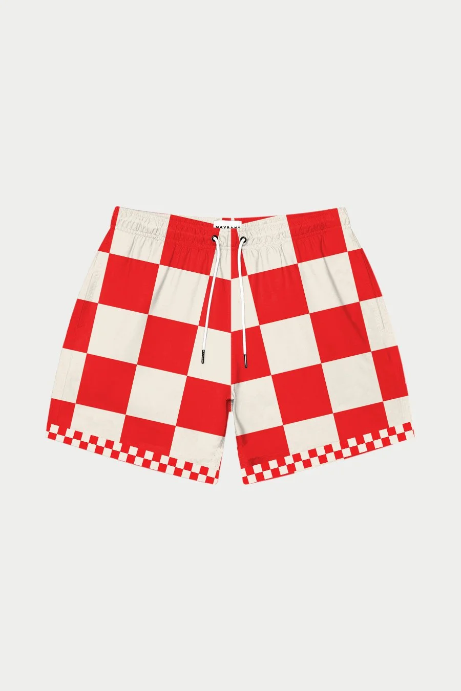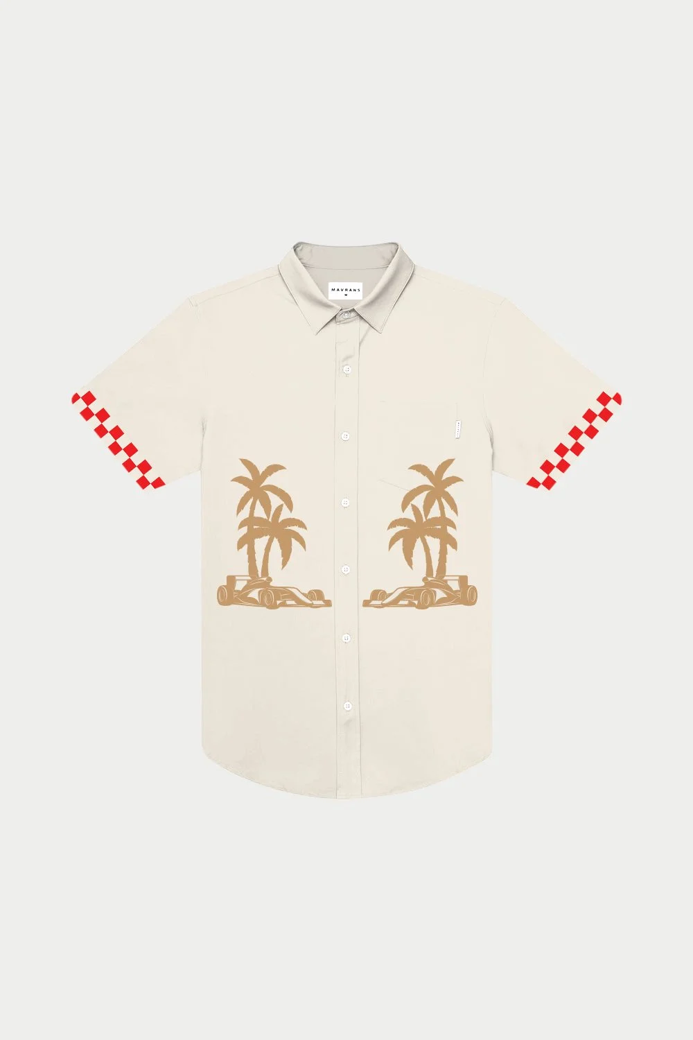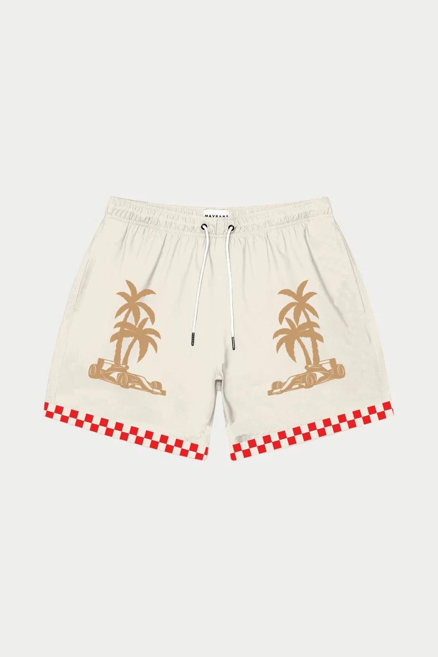 Checkered patterns with palm trees and race cars on knits and swimwear; t-shirt with custom illustration and typography.