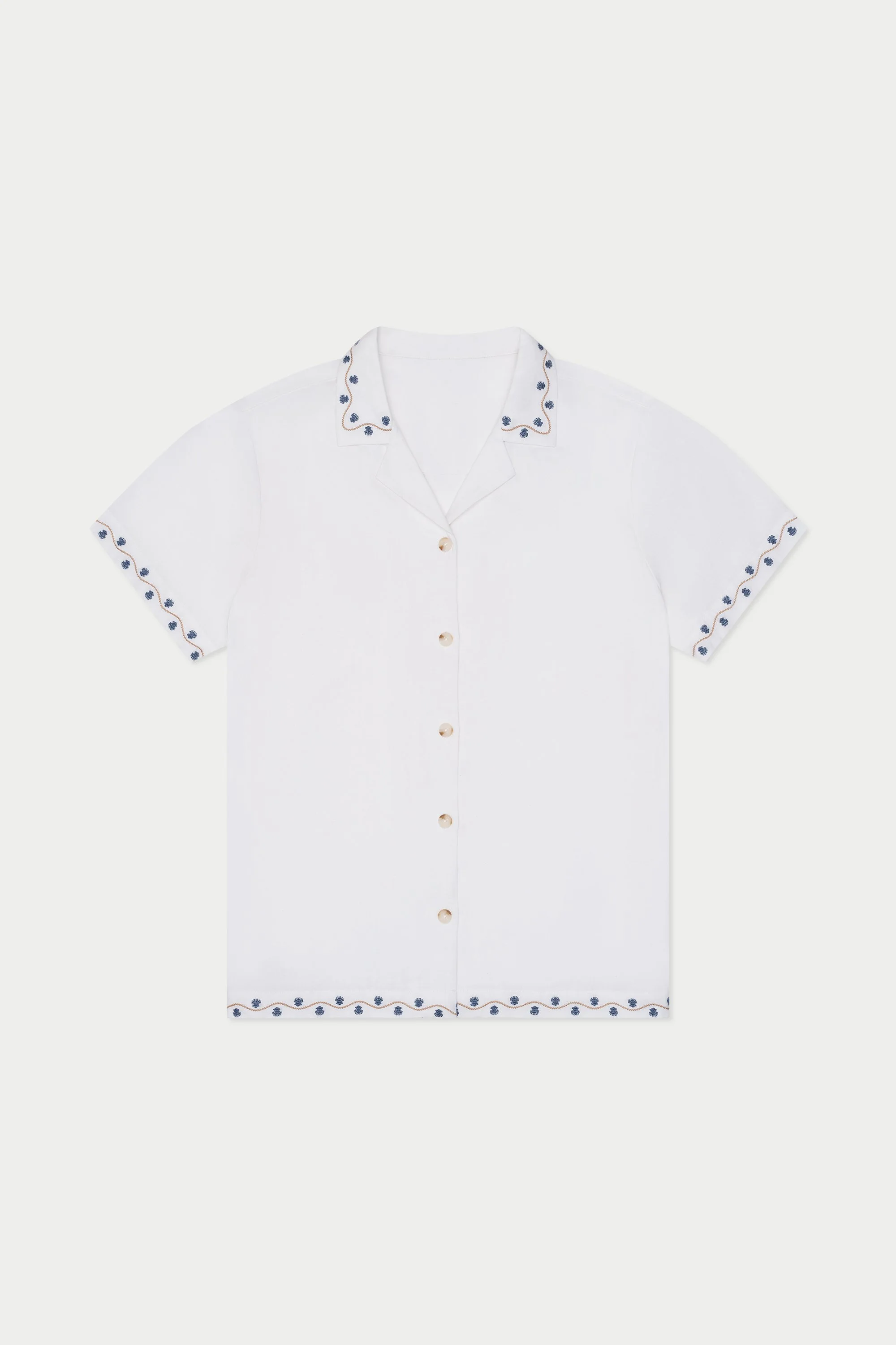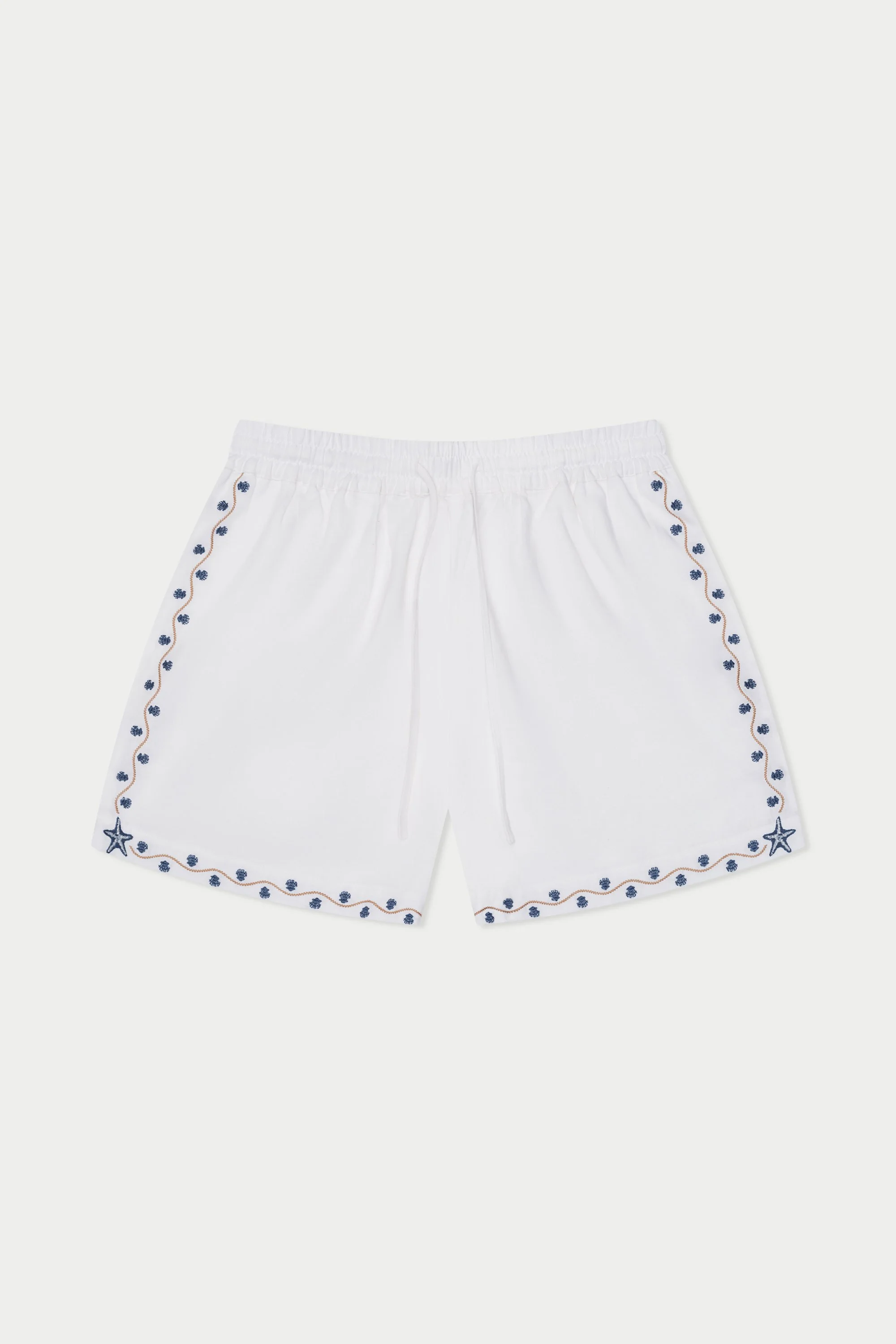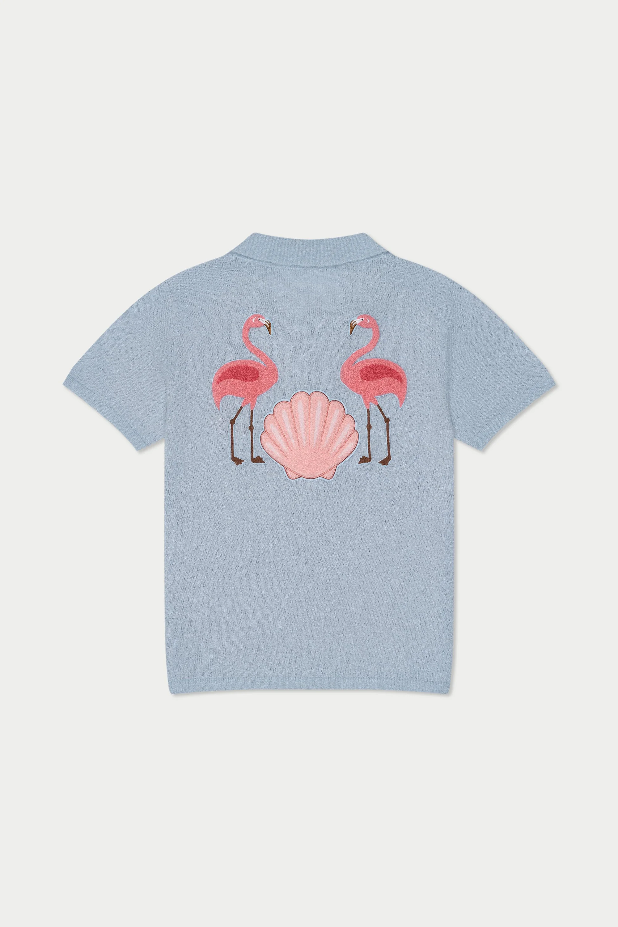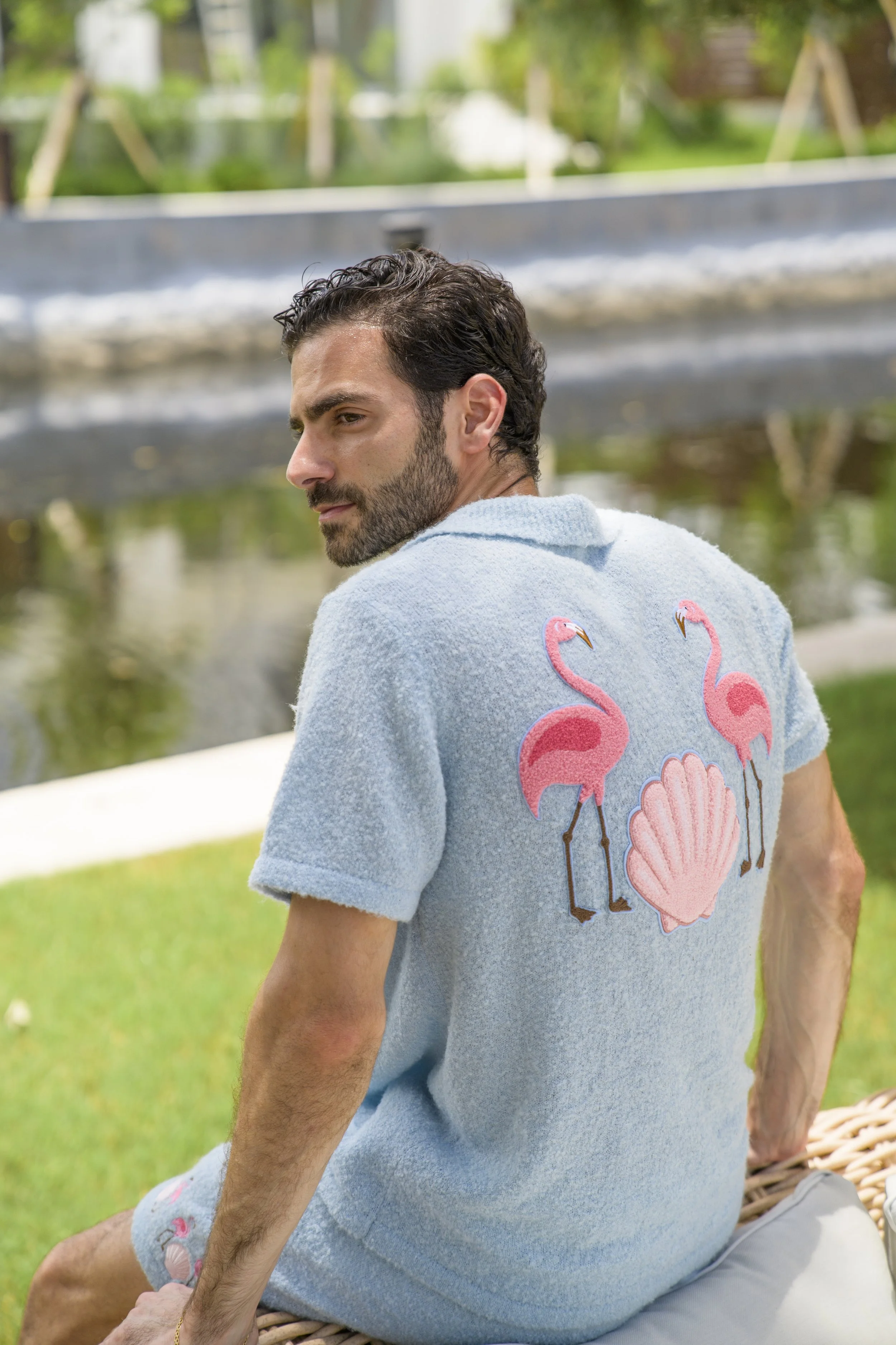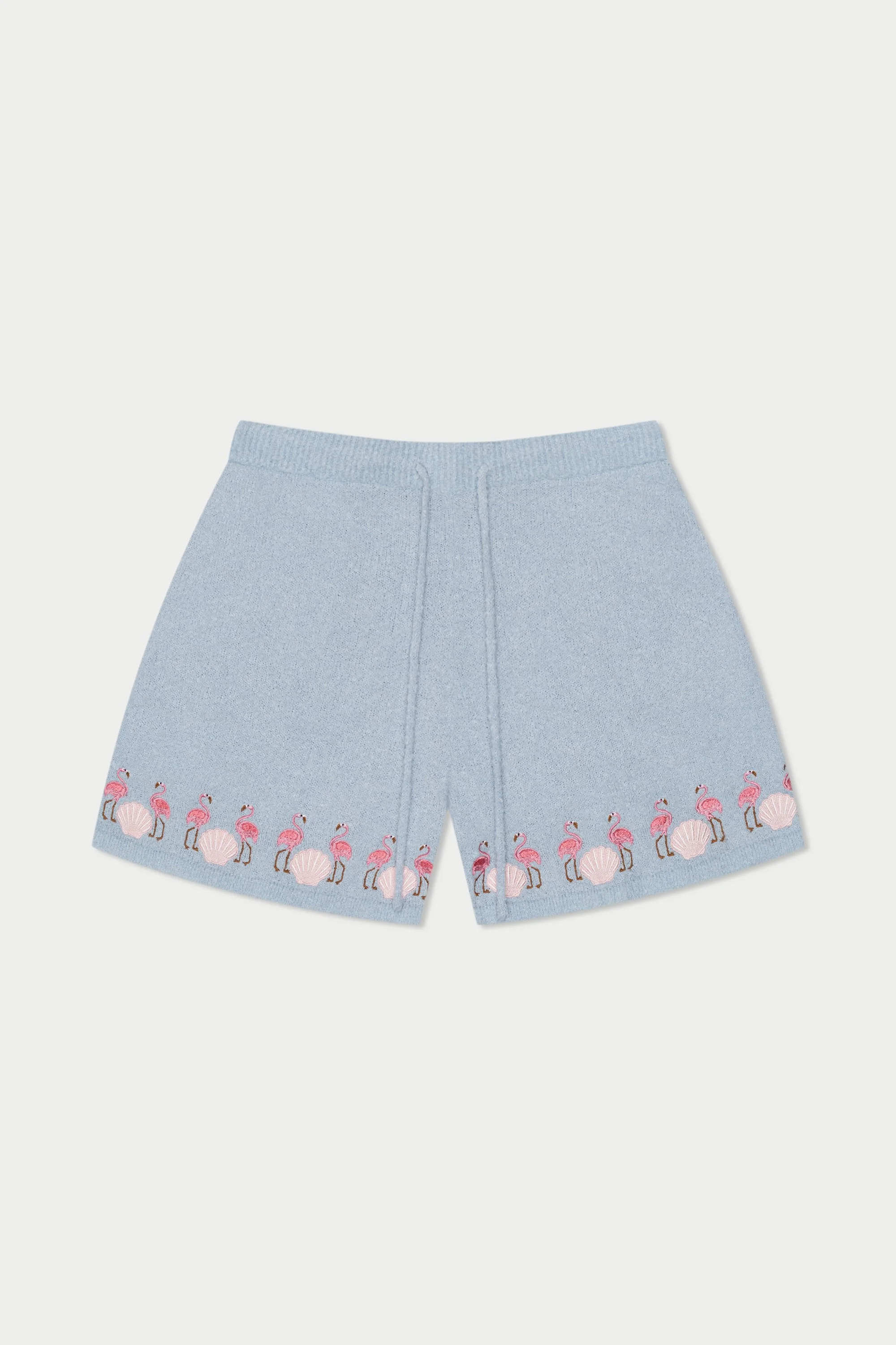 Flamingo and seashell motifs embroidered on linen and bouclé.